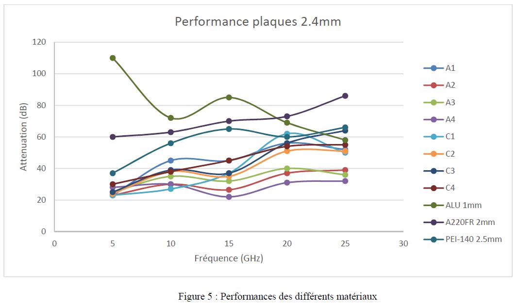 Le graphique suivant donne l’atténuation apporté par les différents matériaux de blindage pour des fréquences allant de 5 à 25GHz.
