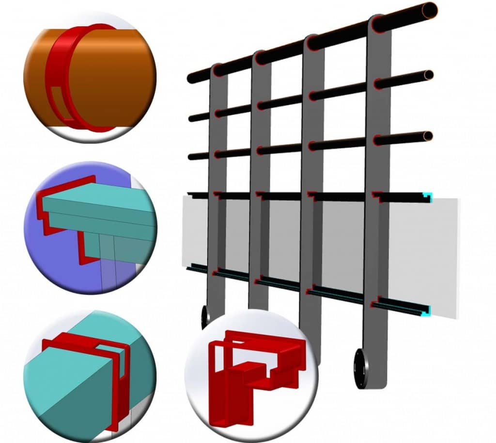 Les avantages de ces inserts sont une absorption des vibrations, un calage des éléments de rambardes afin de diminuer le différents jeux, ce qui donne une impression de sur-mesure très qualitative, aupres des clients finaux.